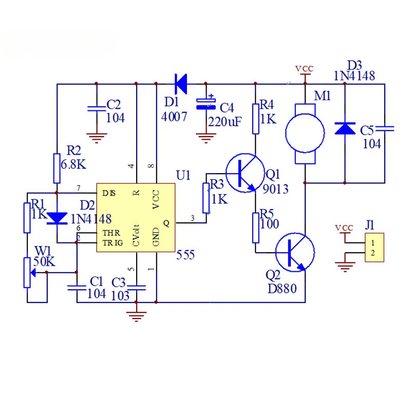 555 pulse width speed controller kit, can be used for school electronic production training, and for electronic enthusiasts to assemble and use. D1 is used to prevent NE555 from being damaged due to incorrect power direction connection. D2, C1, R1, R2, W1, and IC1 form a pulse generator with adjustable pulse width. Adjusting potentiometer W1 can change the pulse frequency and pulse width output by U1 NE555. The output pulse is driven by R3, R4, R5, Q1, and Q2 to regulate the speed of the motor. D3 and C5 eliminate the back electromotive force generated by the motor to protect the triode. C2 and C4 are used for power filtering, and C3 is a stable reference voltage to eliminate interference.